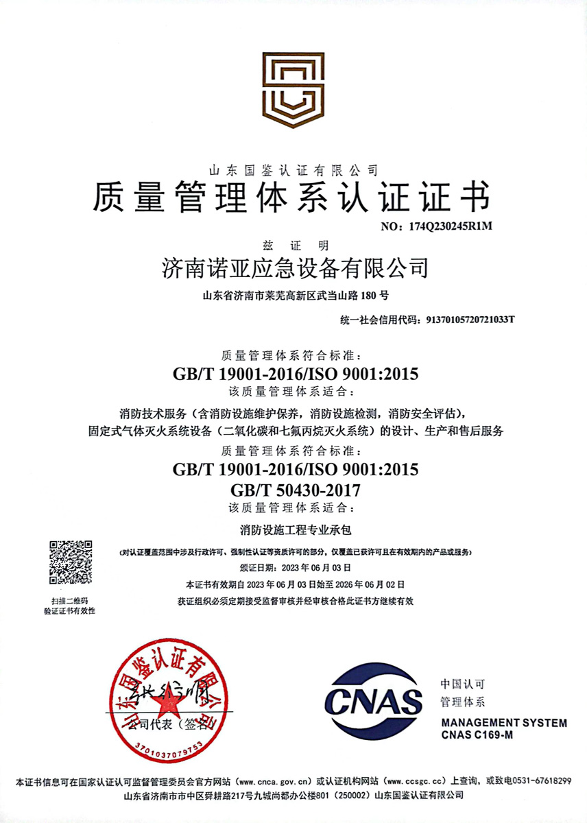 公司技术力量雄厚,设施齐全,拥有完善的质量保证体系。先后通过ISO9001质量认证体系、消防产品自愿性认证体系。同时还具有特种设备检验检测资质、消防设施工程专业承包壹级资质、消防设施维保检测资质等。多年的技术沉淀,严谨的生产管理态度,先进的质量保证体系,完备的售后服务深得广大用户的信任。